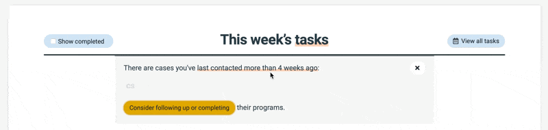 Follow up with members Last updated on Jan 9, 2024 Coachspect will notify about idle cases that haven't been completed yet.You can click on the member initials or name to access the case, or use the phone and message shortcuts to add a new call record or send a new message. Previous Managing tasks Next Unread messages