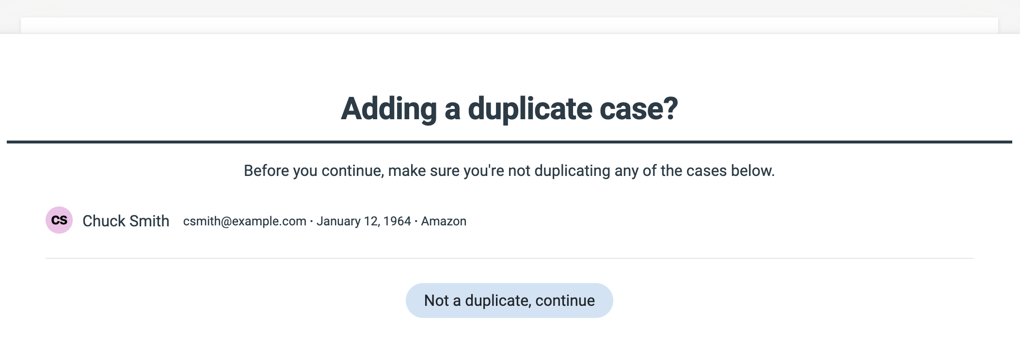If there are potential duplicates, you'll see them listed. You can then choose to either click into one of the existing cases from the list or ignore the alert and continue with adding the new case.